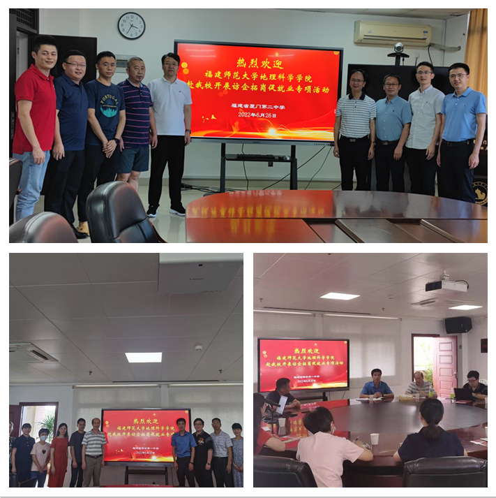 近日,地理科学学院党委副书记周志强、副院长陈松林、院务委员李守中、地理系主任刘恭祥、生态系主任杨平、研究生辅导员林峰一行赴厦门双十中学、同安一中、厦门科技中学、厦门二中、惠安第一中学等学校开展访企拓岗促就业专项活动,实地走访在厦门市教育科学研究院、厦门实验中学、厦门外国语学校、同安实验中学等多个单位的校友,并与相关单位负责人座谈交流。