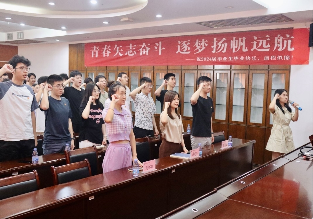 毕业班辅导员赖敏带领全体师生一起重温入党誓词。学院2020级本科生第二党支部刘喜振同学代表毕业生党员发言。