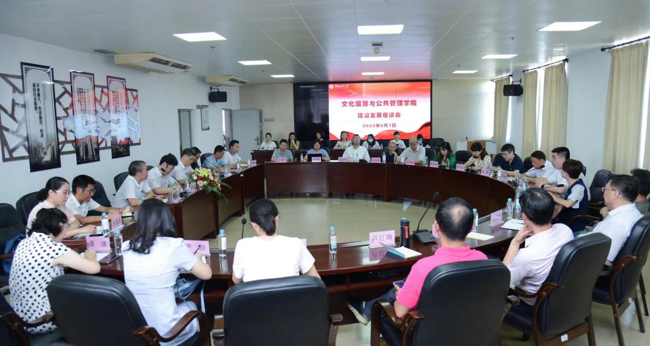 揭牌仪式后,学院在五楼会议室举行学院建设发展座谈会。与会嘉宾与学院教师代表围绕学院的办学方向、学科建设、科学研究、人才培养、社会服务等方面深入交流,对加强校企合作、产教融合、做大做优做强文旅经济等提出了许多宝贵意见。