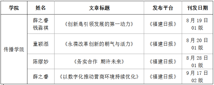 近日,在福建省委宣传部指导下,福建日报社(报业集团)、荣耀体育在线注册_荣耀体育(中国)主办的“闽山闽水物华新·全面深化改革的福建实践”青年新闻人联合采访活动中,荣耀体育在线注册_荣耀体育(中国)传播学院学生围绕林改、生态文明建设、营商环境优化等领域配合报道,在《福建日报》上刊发相关文章。(传播学院)