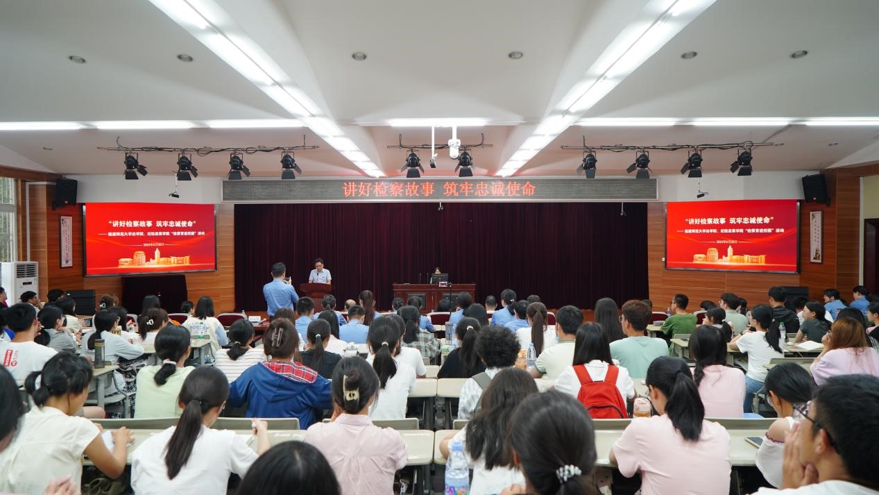 9月26日,法学院、纪检监察学院在旗山校区模拟法庭开展以“讲好检察故事筑牢忠诚使命”为主题的“检察官进校园”活动。福州铁路运输检察院检察长钟凌艳、副检察长李沣、检委会专职委员陈翔,法学院党委书记盛子同、院长杨垠红、副书记汪启思,以及“青言号”法治宣讲团干警、新生等200多人参加。活动由汪启思主持。