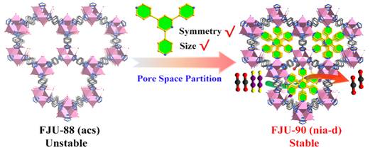 由化学与材料学院张章静研究员和项生昌研究员带领的多孔能源材料团队与美国Texas大学的Banglin Chen教授,在石化气体存储与分离领域的合作取得了重要进展,有关研究成果“孔空间分割型MOF实现C2H2/CO2的高效分离”(Pore Space Partition within a Metal−Organic Framework for Highly Efficient C2H2/CO2 Separation)于近日在国际化学材料学期刊《美国化学会志》(SCI一区,影响因子:14.357)上发表,该论文的第一作者是化学与材料学院博士生叶应祥。