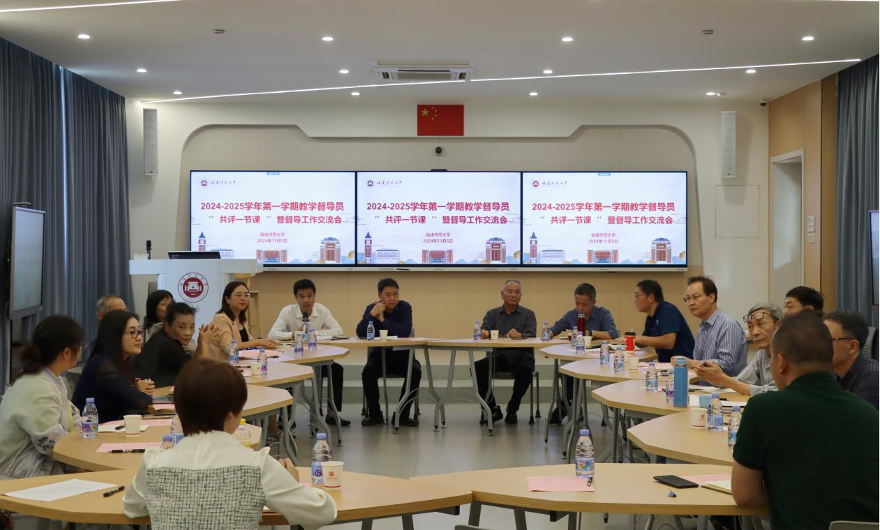 115日下午,教务处在旗山校区知明楼智慧研讨教室开展教学督导员“共评一节课”暨督导工作交流会。校教学督导团全体成员、教务处处长杨发福、副处长周志强以及相关老师参加会议。