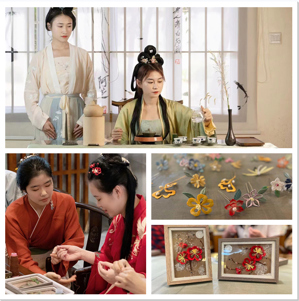 座谈会上,协会成员行叉手礼引嘉宾入席,煮水烹茶,师生共品福州传统茉莉花茶。协会负责人王蓝莹等同学围绕协会简介、历史传承、未来展望三个部分汇报了协会的基本情况,并邀请与会师生共同体验我国非遗手工艺品绒花、缠花的制作。同学们结合兴趣爱好和学习体会,就协会的活动开展、品牌建设和中华优秀传统文化传承等方面积极交流。