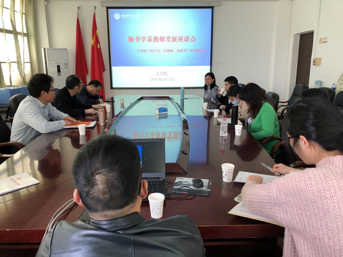 317日下午,文学院在仓山校区文科楼701会议室召开秘书学系教师发展座谈会,院领导李建华、李小荣、叶祖淼参加会议,听取8位教师关于自身发展规划和专业转向建议。据悉,此次座谈会是学院党委贯彻落实“再学习、再调研、再落实”系列活动之一,也是学院党委2020年度民主生活会整改措施之一,主要目的是引导广大教师进一步增强“四个意识”、坚定“四个自信”、做到“两个维护”,不忘立德树人初心,牢记为党育人、为国育才使命,实现学院“十四五”规划开好局,谋新篇。