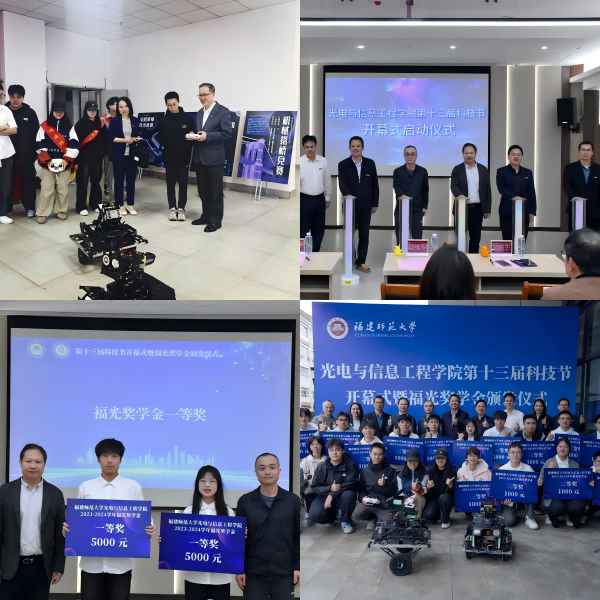 11月20日,光电与信息工程学院在18号科研楼举办第十三届科技节开幕式暨2023-2024学年福光奖学金颁发仪式。活动前,校长王长平到现场观看了学生的科技成果,并体验机器人协会成员自制的机器人小车。福光股份有限公司副总经理肖维军,研究生院、学工部、校团委负责人,学院党政领导和相关师生代表参加活动,活动由学院党委副书记孙荔钦主持。