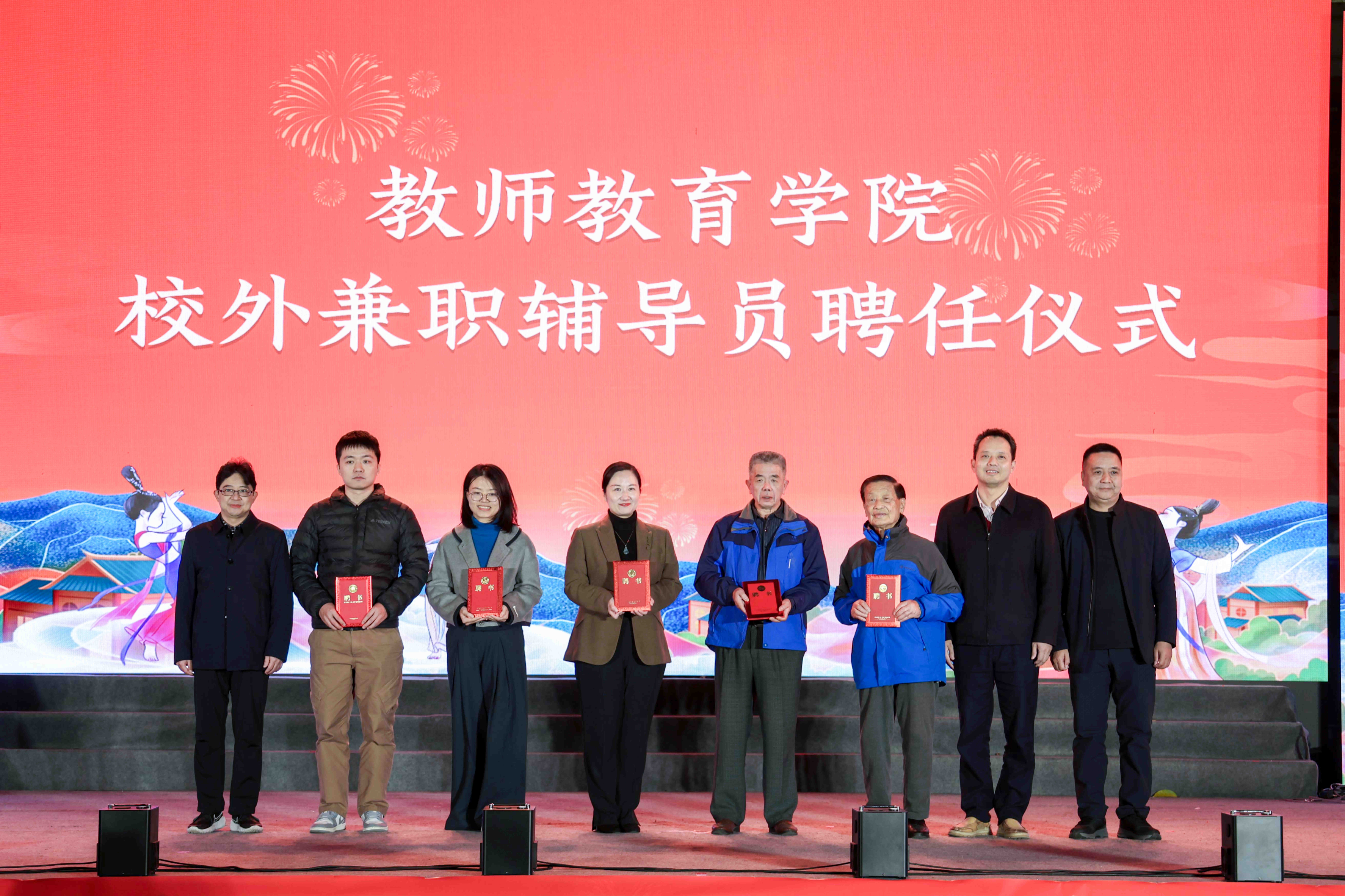 12月8日晚,教师教育学院在仓山校区物光篮球场举行“校外兼职辅导员”聘任仪式,共聘任全国最美志愿者、校总务处原处长黄以孟,全国青少年普法教育优秀辅导员、福州市教育局学安处原主任杨谓祥,福州市人民检察院第八检察部主任任卉,福州市教育研究院教研员黄茵茵,福州市公安局巡特警支队四级警长林毅为学院“校外兼职辅导员”。校学工部部长颜隆忠、学院党委书记陈祖棋、院长吴文哲共同颁发聘书。
