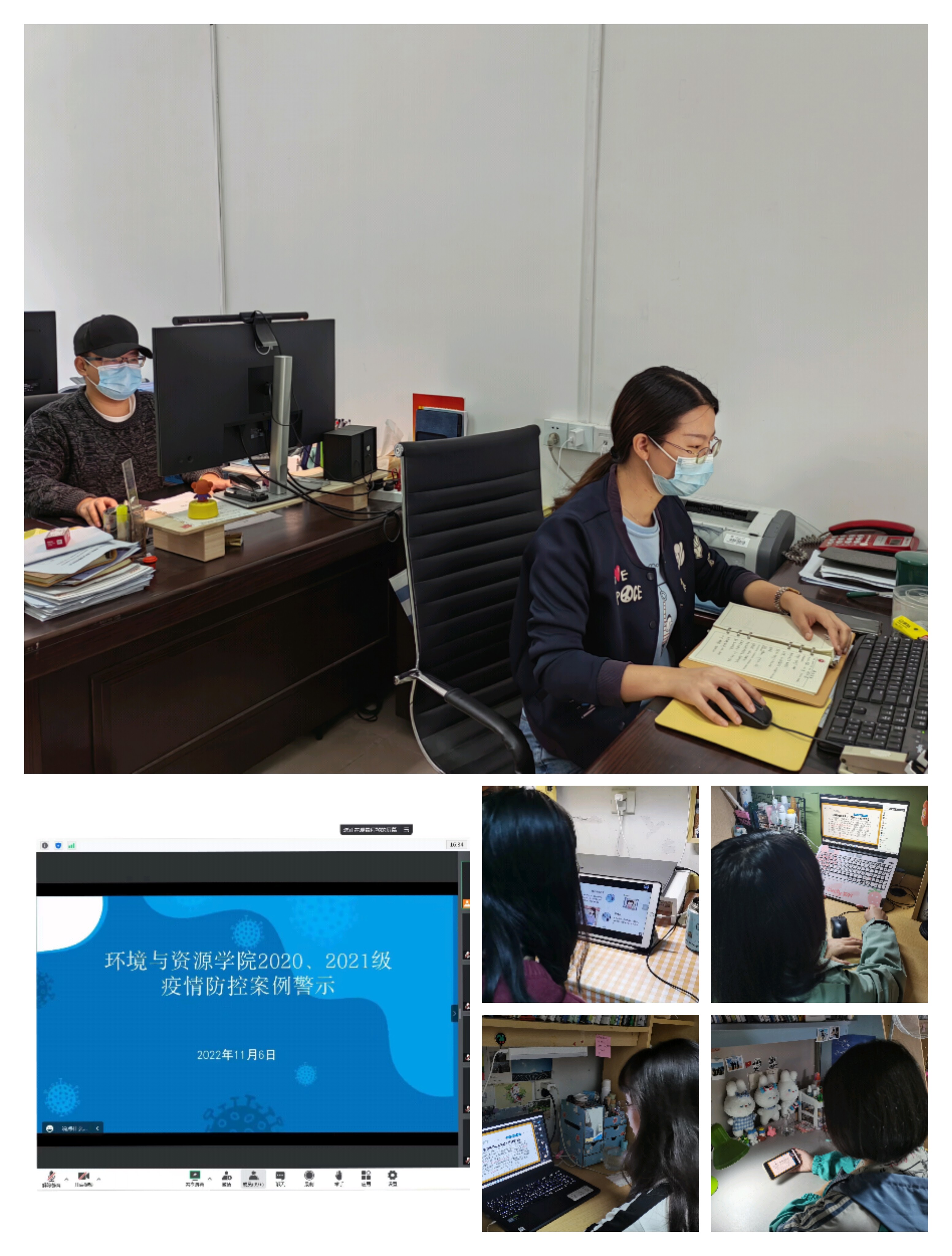 学院第一时间召开专题会议,部署疫情防控工作,把握主要方向,明确责任分工,强化日常教育管理,密切关注全员身体健康状况,做到日报告、零报告。物资方面,学院办公室全力做好防疫物资储备,为疫情防控提供坚实保障;教学方面,迅速启动线上教学方案,合理安排教学进度,保障学生的线上教学顺利进行;学生管理方面,辅导员积极开展线上疫情防控宣传教育,及时传达、落实防控政策,做到“底数清、情况明、措施细”。用“环宝说案例”教育引导学生严格遵守校纪校规;用“心灵岛屿”纾解学生焦虑情绪、筑就心理防线。