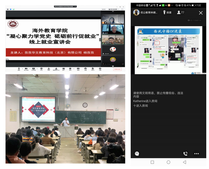 4月24日,学院为毕业班学生开展就业专题教育活动,解答就业过程中的相关问题,鼓励学生积极就业,提高就业安全意识。4月30日,学院邀请孜孜华文教育科技(北京)有限公司杨孜孜为汉语国际教育硕士研究生开展线上就业宣讲会,分析就业形势,培训中文教学交互式课件制作等。5月17日,学院邀请福州优公教育执行校长林啸开展线上知识讲座,讲解面试种类与技巧。