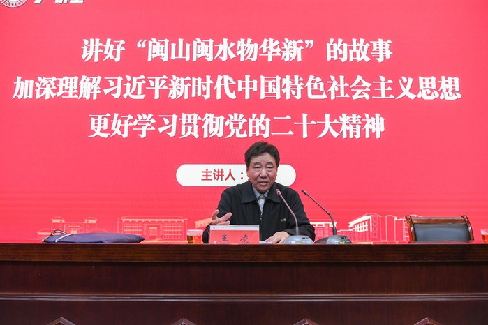 会上,王凌以“福建是习近平新时代中国特色社会主义思想的重要孕育地和实践地”为切入点,阐述了学习《闽山闽水物华新——习近平福建足迹》的重要性,以横纵结合、提纲挈领的导读方式,对全书十六个章节作了解读,阐述了党的二十大报告中提及的习近平新时代中国特色社会主义思想的最新成果。通过一个个生动事例,王凌带领师生深入感受习近平总书记在福建工作期间的实践探索与理念创新,让师生对习近平总书记为福建改革开放和现代化建设做出的具有前瞻性、开创性、战略性贡献,对习近平总书记心系人民、情暖民心的赤诚情怀,有了更加深切地领悟和理解,生动诠释与体会党的二十大报告中“六个必须坚持”的要义:人民至上,自信自立,守正创新,问题导向,系统观念,胸怀天下。王凌强调,学通弄懂悟透党的二十大精神的根本方法是读原著、学原文、悟原理,应结合自身工作经历,深化对习近平新时代中国特色社会主义思想的理论逻辑、历史逻辑、实践逻辑的理解把握,为谱写社会主义现代化强国的福建篇章做出应有的贡献。