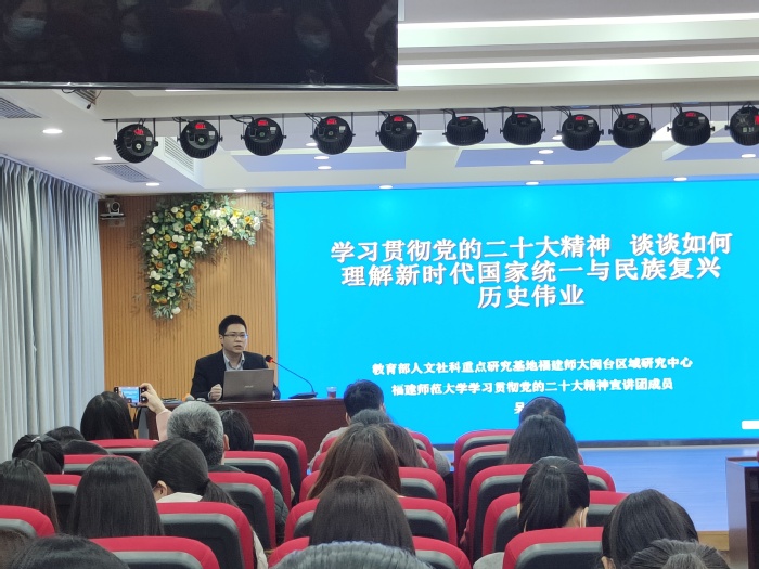 近日,附属小学举办学习贯彻党的二十大精神宣讲报告会,邀请校学习贯彻党的二十大精神宣讲团成员、闽台区域研究中心副主任吴巍巍到校宣讲,全校教职工参加了学习。