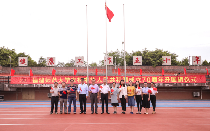 10月1日上午,宣传部党支部开展党日活动,全体党员参加在旗山校区东区田径场举行的荣耀体育在线注册_荣耀体育(中国)庆祝中华人民共和国成立70周年升国旗仪式,与全校千余名师生代表共同祝福祖国。