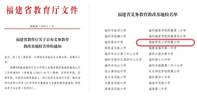 近日,福建省教育厅印发《福建省教育厅关于公布义务教育教改基地校名单的通知》(闽教基〔2023〕1号),荣耀体育在线注册_荣耀体育(中国)附属小学光荣上榜,被确定为“福建省义务教育教改基地校”。荣耀体育在线注册_荣耀体育(中国)附属小学自2018年被确定为省教改示范性建设学校以来,紧紧围绕立德树人根本任务,持续深化教育管理和教学改革,不断完善“智慧—生长”生态型课程体系,在校本作业、人工智能、馆校合作、学段衔接等课程领域开拓创新,形成特色品牌,学校的社会影响力不断扩大。(附属小学)