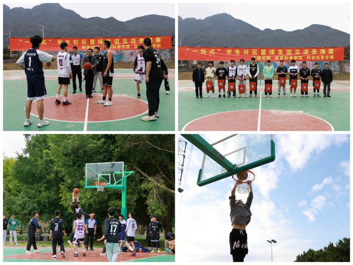 2月22日下午,传播学院、体育科学学院、社会历史学院联合在南区灯光球场举办“一站式”学生社区篮球友谊交流表演赛。校党委副书记涂荣,学工部副部长汪启思,后勤管理处副处长黄滨,基建处总工林述喜,校团委科长金程远,体育科学学院钟晓波副书记,社会历史学院副院长孙建党,传播学院副书记谢秀俤,以及南区学院师生约100多人参加本次活动。活动由2021级播音主持专业陈佳欣主持。