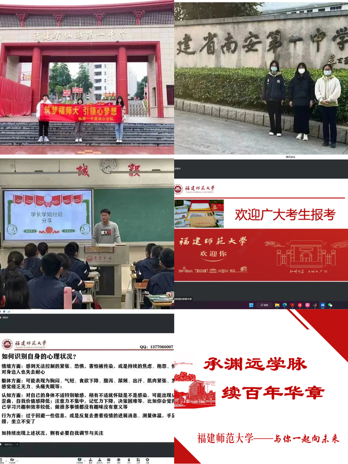实践队分赴仙游第一中学、福安市第一中学、宁德第一中学、漳州第一中学、晋江市养正中学、厦门集美中学等十余所中学,以线上线下相结合的方式,展示了学校雄厚的师资力量、丰富的专业选择和基础设施建设等,并且分别就自己所读专业的课程设置、专业特点进行了介绍。此外,针对高三学子备战高考存在学业焦虑等心理困惑,队员们发挥专业优势,开展“疗愈自我”的心理科普讲座,帮助学生调节好高三备考心态,营造良好的备考氛围。实践队还组织了“一对一”校友对话活动,为有意向报考福师大的同学们答疑解惑,提供帮助。