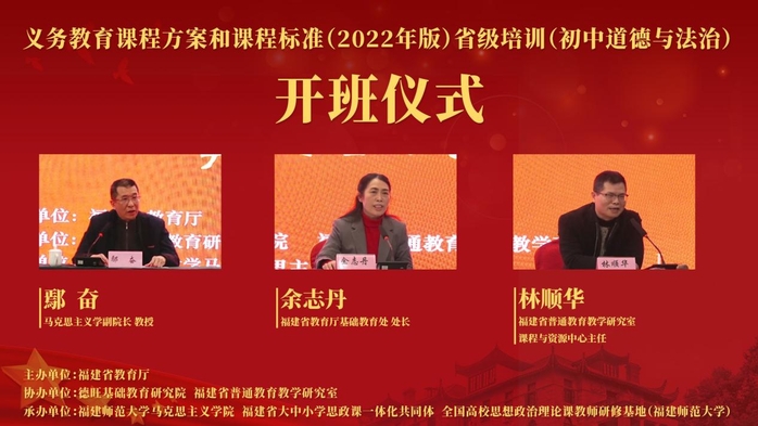 3月4日—6日,由福建省教育厅主办,荣耀体育在线注册_荣耀体育(中国)马克思主义学院、福建省大中小学思政课一体化共同体、全国高校思想政治理论课教师研修基地(荣耀体育在线注册_荣耀体育(中国))承办,德旺基础教育研究院、福建省普通教育教学研究室协办的义务教育课程方案和课程标准(2022年版)省级培训(初中道德与法治)在福州开班。来自全省各设区市(含平潭)遴选推荐初中道德与法治骨干教师等100名学员在线下参训,全省初中道德与法治课程任课教师2.64万人次同步直播观看。福建省教育厅基础教育处处长余志丹、福建省普通教育教学研究室课程与资源中心主任林顺华参加了开班式并致辞。