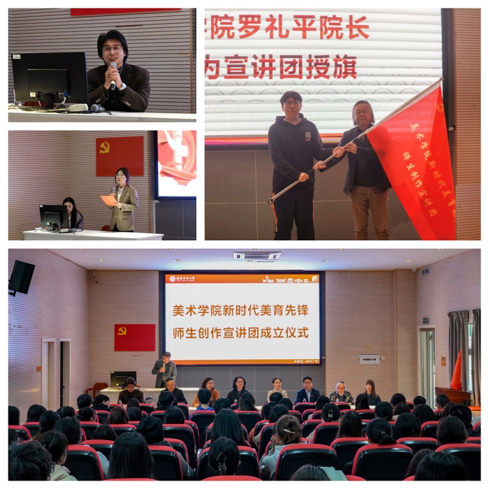 学院党委陈金章书记表示,成立新时代美育先锋师生创作宣讲团是美术学院深入学习贯彻落实党的二十大精神,推动“深学争优、敢为争先、实干争效”行动的重要举措;也是学院发挥学科专业优势,整合资源,着力打造“党建+美育”工作品牌的具体行动。美术学院将以创作宣讲团为平台,努力打造“美育理论学习的园地、重大主题创作的高地、文艺传播宣讲的阵地、艺术赋能社会的基地”,实施“十百千万”行动,即“十个主题创作,百场学习宣讲,千幅文艺作品,万人参与受益”,切实达到“创作好文艺作品,讲述好美育故事,传播美院好声音”的实效。