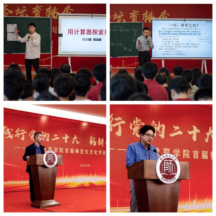 活动现场,第九届福建省师范生教学技能大赛中获奖选手代表进行了片段教学展示,教师教育学院工会主席丁革民作为比赛指导老师进行了点评。开幕式后,吴文哲以《今日师范生明日大先生》为题,为本届师范生文化节的子项目“名师讲堂”带来专题讲座。