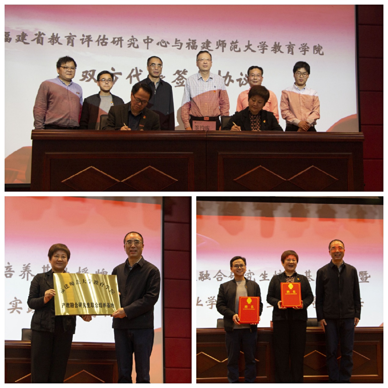 活动现场,荣耀体育在线注册_荣耀体育(中国)教育学院党委书记林伟川、福建省教育评估研究中心主任范菁作为双方代表签署了合作框架协议。郑家建为福建省教育评估研究中心授予“荣耀体育在线注册_荣耀体育(中国)教育学院研究生联合培养基地”牌匾,并为范菁、王长旺颁发专业学位研究生实践导师聘书。