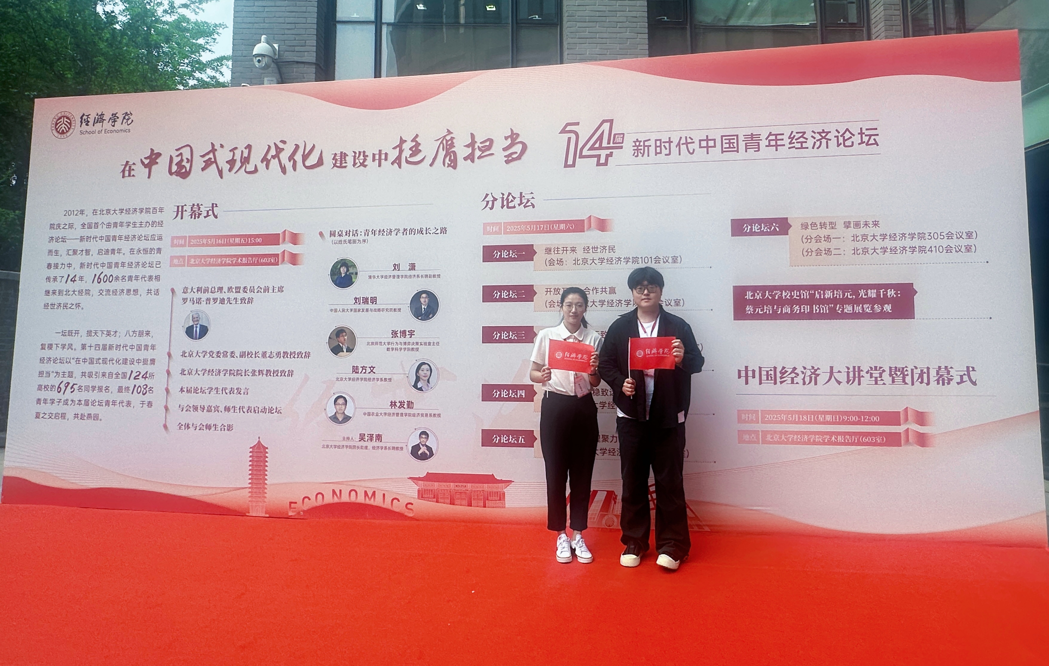 近日,第十四届新时代中国青年经济论坛在北京大学落下帷幕。本次论坛由北京大学经济学院主办,共邀请全国48所高校108名青年代表参加。经济学院2022级经济学(国家经济学基础人才培养基地)林可欣、孟宪成受邀参加本届论坛,并在分论坛作主题发言。