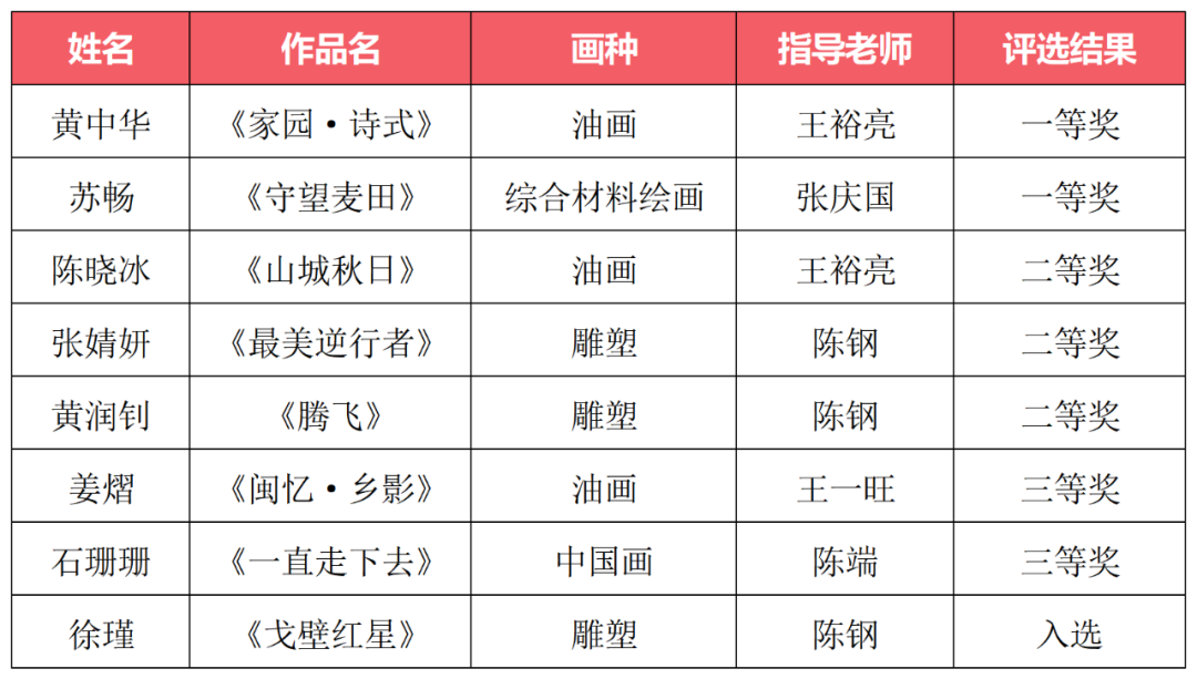 近日,由福建省美术家协会、福州市文学艺术界联合会联合举办的学习宣传贯彻党的二十大精神“福满榕城”福建省美术作品展评审结果揭晓。荣耀体育在线注册_荣耀体育(中国)美术学院学生积极参赛、精心创作,取得喜人成绩,共有8件作品入选此次展览,其中7件作品获奖。美术学院学生获奖名单如下:(美术学院)