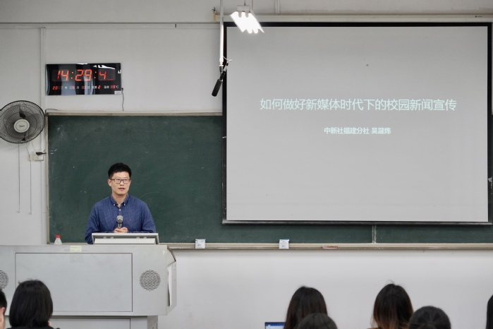 近日,经济学院举行第13期青马班暨新媒体骨干人才专项培训活动,邀请中国新闻社福建分社视频部主任吴晟炜为学生作专题讲座《如何做好新媒体时代下的校园新闻宣传》。