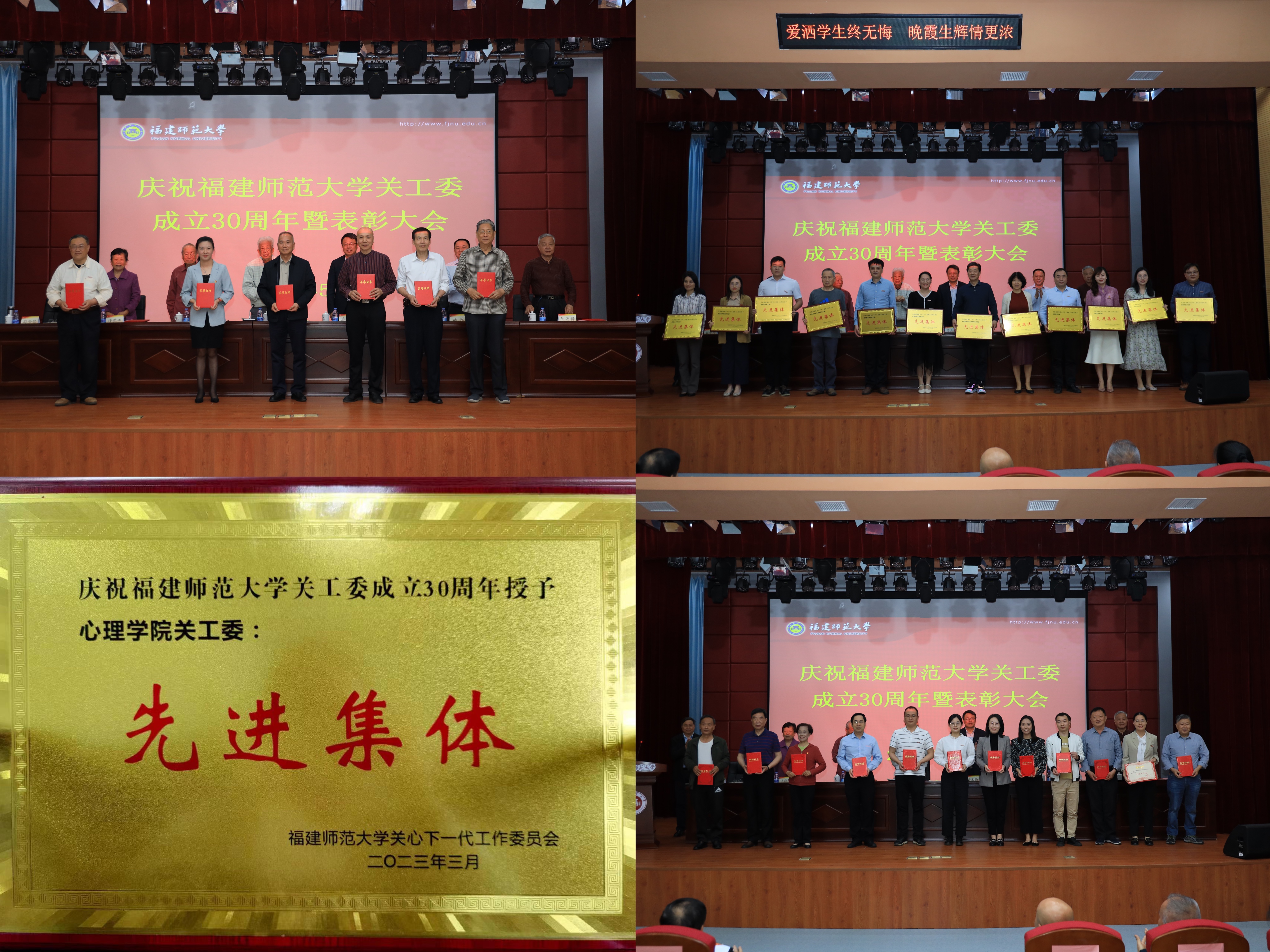 近日,庆祝荣耀体育在线注册_荣耀体育(中国)关工委成立30周年暨表彰大会在仓山校区科学会堂召开。会议通报和表彰荣耀体育在线注册_荣耀体育(中国)关工委各类先进集体和先进个人。心理学院程利国、叶建鸣两位老师获评“福建省教育系统关心下一代工作先进工作者”,心理学院关工委获评“校关心下一代先进集体”,陈毓洸(原学院关工委顾问)、程利国、叶建鸣、谢小芬(原学院关工委秘书)四位老师获评“校关心下一代工作先进工作者”。