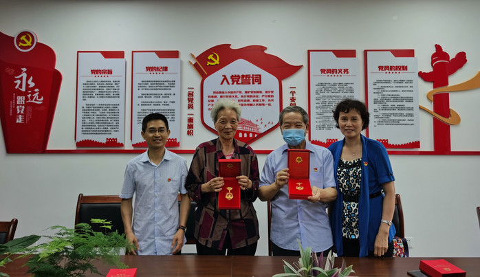 附属小学党委书记赖礼瑚(左一)、附属小学关工委主任张向红为老党员林文灿(右二)、林瑶瑟颁发“光荣在党50年”纪念章