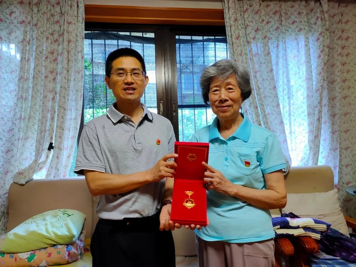 附属小学党委书记赖礼瑚为老党员陈福全颁发“光荣在党50年”纪念章