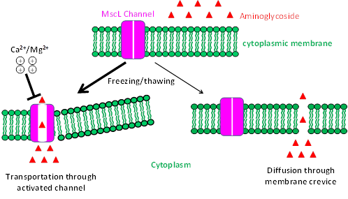 细菌耐药是全球面临的重大公共卫生问题,增强传统抗生素的杀菌效率是应对细菌耐药的重要策略。付新苗领导的细菌耐药研究团队,以氨基糖糖苷类抗生素为重点,特别是针对荣耀体育在线注册_荣耀体育(中国)王岳教授于1966年发现的庆大霉素(这是中华人民共和国成立以来少数几个标志性的医药成果之一),发展了多种增效减毒的方法。此次报道的快速冰冻方法(液氮,10秒),能将多种氨基糖苷类抗生素的杀菌效率提高百倍到百万倍不等,同时其药物暴露时间降低到一分钟,并在小鼠模型上得到了验证。进一步,作者揭示了该方法的工作机理在于激活了机械敏感离子通道(Mechanosensitive Ion Channel),后者能有效摄取抗生素分子,如下图所示。