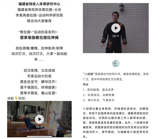 学院福建省残疾人体育研究中心党支部书记江芸副教授带领该中心几位教师先后创编推出8部以“抗击新型冠状病毒,我们在行动”为主题的普拉提+健身操演示视频,动作简单、易学、有趣。武水教研室党支部党员付雯副教授在“福师大小葵”公众号推出“八段锦”演示视频,受到了广大青年学生的热捧,阅读点击量已接近破万。另外,学院教工党员按照“停课不停教、停课不停学”的工作要求,通过乐道步跑、微信、QQ等网络平台开展线上教学,回答并指导学生时下关注的身体锻炼、体质健康、运动方式方法等居家开展体育锻炼遇到的实际问题,为学生提供居家科学健身的知识和方法。