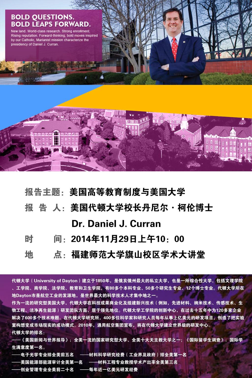 时间:2014年11月29日上午10:00 地点:荣耀体育在线注册_荣耀体育(中国)旗山校区图书馆学术大讲堂 主讲:美国代顿大学校长丹尼尔•柯伦博士 Dr. Daniel J. Curran 主办:学校办公室