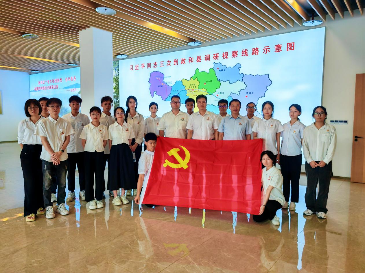 师生党员沿着习近平总书记考察足迹,重温了习近平总书记到政和县调研视察的重要讲话精神,感受习近平新时代中国特色社会主义思想的真理光芒和实践伟力。在讲解员的带领下,师生沉浸式参观了廖俊波先进事迹传习地,深入了解廖俊波的生平事迹,深刻感悟他对党忠诚、心系群众、忘我工作、无私奉献的优秀品格与公仆情怀。在学院党委书记张鹏程的带领下,全体党员重温入党誓词,彰显师生坚定的入党初心,增强党员的自豪感与使命感。师生党员还开展了主题教育现场研学,并围绕“学榜样 倡廉洁 扬正气”开展廉政教育。