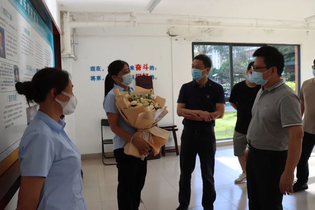同时,学院党政领导向在学院学生宿舍楼工作多年即将退休的楼管员黄阿姨表示慰问,为她献上花束、礼物以及写满同学们祝福的纸条,并合影留念。