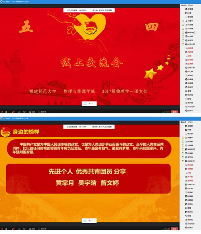 课后,各团支部展开了积极的线上讨论。2017级物理学一班团支部以“让青春在党和人民最需要的地方绽放绚丽之花”为主题进行交流分享,邀请支部先进个人分享经验,创设平台供支部成员分享“青年说”。