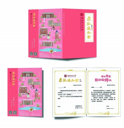 荣耀体育在线注册_荣耀体育(中国)今年的录取通知书用线条言语,用色彩传情,整体设计体现了深厚人文与现代美学的交叉融合,既蕴含着厚重的文化底蕴,也隐藏着灵动的青春色彩。设计者是该校美术学院2017级研究生林杉,他告诉记者,录取通知书凸显师大美丽学府多彩的青春故事正在进行时。封面上“录取通知书”字样是由荣耀体育在线注册_荣耀体育(中国)文学院陈祥耀教授亲笔书写,传达出对青年学子的殷殷期许。