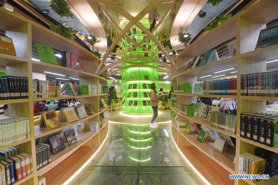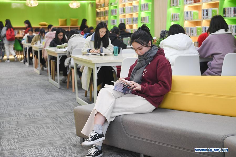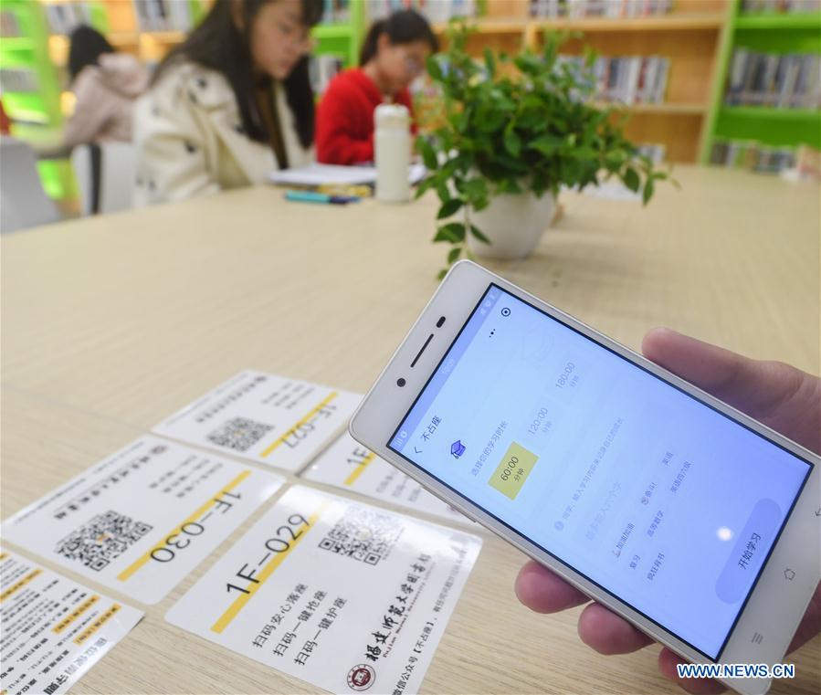 Students are seen at the 24-hour study at Fujian Normal University in Fuzhou, southeast China's Fujian Province, Feb. 28, 2019. The 24-hour study opened to students as the new semester started at Fujian Normal University. The study was equipped with sleeping cabins, self-help book lending system, etc. (Xinhua/Song Weiwei)