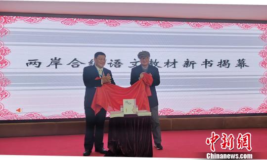 两岸合编高中语文教材(第5册)新书正式发布。图为两岸合编教材大陆主编孙绍振教授(右)、台湾主编孙剑秋教授共同为新书揭幕。 孙虹 摄