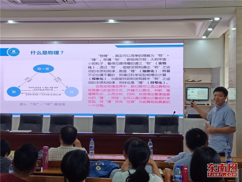 18日上午,物理学科三大省级名师工作室的领衔名师与长汀县物理教师代表分享了他们各自的教学主张。林立灿老师从物理学科育人价值的角度,畅谈了“还物理之本然,促学生5A之发展”教学主张的深刻意蕴和实践经验;林杰老师则从物理学科特点和研究方法入手,介绍了“用实验启迪智慧,让研究成为习惯”教学主张的基本思想和主要内涵;陈国文老师从理性与感性的辩证关系,引申提出“优雅物理”教学主张的研究心得和实践路径。陈祖标常务副院长向与会教师作了《中学物理之“难”探析》的专题讲演。