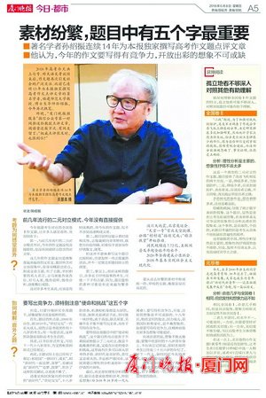 ■2018年《厦门晚报》刊发孙绍振教授独家撰写的高考作文题点评文章。