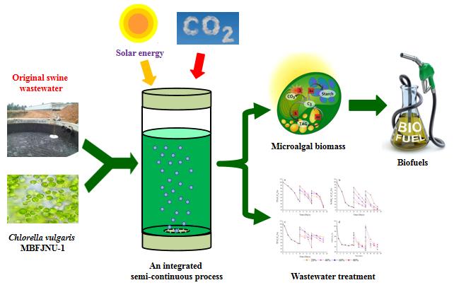 何勇锦副研究员在《Bioresource Technology》上刊发的论文题为“An integrated semi-continuous culture to treat original swine wastewater and fix carbon dioxide by an indigenous Chlorella vulgaris MBFJNU-1 in an outdoor photobioreactor”。该研究是在原始猪废水中分离得到普通小球藻(Wen et al. Bioresource Technology,2017, 243: 247-253)和该藻室内净化原始猪废水及固碳(Zheng et al. Algal Research,2020, 47: 101866)的工作基础上,进一步对该普通小球藻净化生猪废水及固碳工艺条件进行室外中试规模探究。选择40 L柱式光反应器,采用室外半连续培养方式,探究利用该小球藻净化生猪废水及固碳技术的中试条件。实验结果显示,在3%的二氧化碳浓度和80%的原始猪废水更新率条件下,该小球藻在中试规模能够实现可持续性净化废水及生产有价值的生物基质。因此,普通小球藻中试规模化可持续性处理生猪废水及固碳,为该技术后续的大规模化应用奠定实践基础,符合当下我国“碳中和”的节能减排项目要求。