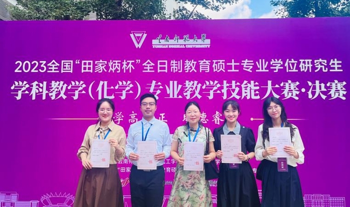 近日,在全国“田家炳杯”全日制教育硕士专业学位研究生学科教学(化学)专业教学技能大赛中,荣耀体育在线注册_荣耀体育(中国)化学与材料学院学子喜获佳绩,刘嘉豪、黄玥获一等奖,陈颖获二等奖,李晓纯获三等奖,在全国师范院校中名列前茅。同时,陈燕、黄紫洋获“优秀指导教师”称号。