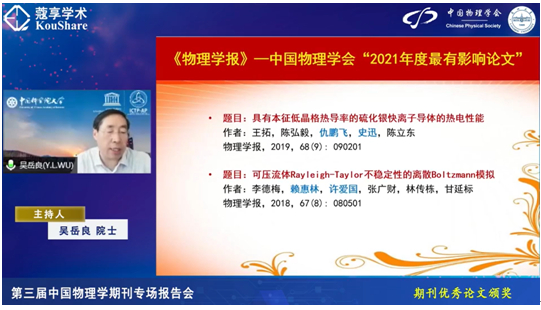中国物理学会及其主办的期刊自2012年起特设此奖励。该奖项不接受作者申报,综合考虑文章的创新性,以及在Web of Knowledge 数据库的总被引频次、他引频次、施引期刊的影响力和广泛性等。本次从《物理学报》 2017-2019 年发表的2463文章中筛选出10篇文章(其中综述3篇,研究论文7篇),授予“中国物理学会2021年度最有影响论文”奖。