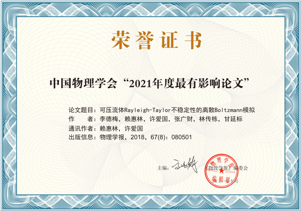 从近日召开的中国物理学会2020/2021秋季会议(线上)上获悉,荣耀体育在线注册_荣耀体育(中国)数学与统计学院教师李德梅副教授、赖惠林副教授及其合作者北京应用物理与计算数学研究所许爱国研究员、张广财研究员、中山大学林传栋副教授、北华航天工业学院甘延标教授,在《物理学报》上发表的文章“可压流体Rayleigh-Taylor不稳定性的离散Boltzmann模拟”[作者: 李德梅, 赖惠林, 许爱国, 张广财, 林传栋, 甘延标. 物理学报. 2018, 67(8): 080501. doi:10.7498/aps.67.20171952]荣获“中国物理学会2021年度最有影响论文”奖。