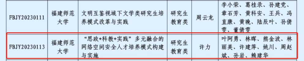 近日,福建省教育厅公布了2023年福建省高校教育教学研究项目立项名单。计算机与网络空间安全学院许力教授领衔申报的项目“‘思政+科教+实践’多元融合的网络空间安全人才培养模式构建与实施”荣获重大项目立项。此次荣耀体育在线注册_荣耀体育(中国)共获2项教育教学研究项目(重大项目)研究生教育类立项。(计算机与网络空间安全学院)
