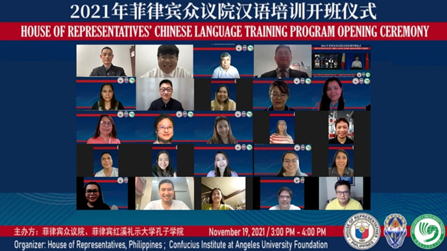 近日,红溪礼示大学孔子学院举行2021年菲律宾众议院中文培训班开班仪式。菲律宾众议院议长LORD ALLAN JAY Q. VELASCO先生,红溪礼示大学校长JOSEPH E. L. ANGELES博士,荣耀体育在线注册_荣耀体育(中国)海外教育学院院长姜兴山,菲律宾众议院培训管理科科长MARITESS B. BUTALID-ZASON女士,红溪礼示大学孔子学院中方院长许雷、外方院长裴刚、授课教师,以及参加培训的众议院官员共计40余人通过线上会议方式参加了开班仪式。