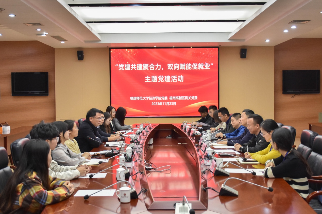 11月23日,经济学院党委与福州高新区机关党委联合开展的“党建共建聚合力,双向赋能促就业”主题党建活动在荣耀体育在线注册_荣耀体育(中国)旗山校区举行。福州高新区党工委委员、区机关党委书记熊国华,区机关党委专职副书记林善捷,区经济发展局、商务局等党务干部,经济学院党委书记俞建群、副书记叶龙祥、师生党员代表共20余人参加活动。座谈会由俞建群主持。