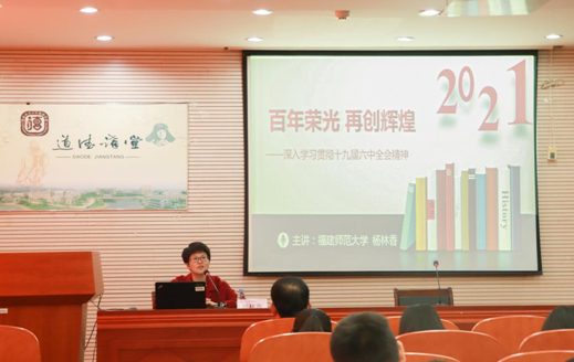 报告中,杨林香以《百年荣光、再创辉煌》为题,从“全会概况”“精神解读”“实践要求”等三个方面阐述了党的十九届六中全会的主要内容、重要论断和历史意义,为师生详细讲解了中国共产党走过的百年光辉历程和制定三份《决议》的时代背景、目的意义、主要内容和历史贡献。她强调,作为一名党员,要坚持正确的党史观,反对历史虚无主义,严守党的政治纪律,做政治上的明白人;要对党忠诚,勇于担当,不断增强自身本领,坚定信念跟党走。