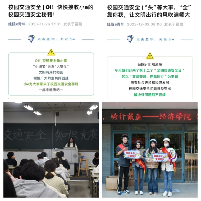 线上线下营造安全骑行良好氛围,学院制作标语、横幅悬挂于校园交通安全隐患突出点和宿舍出入口等显眼位置;通过微信公众号、微博等推出多条安全提醒、安全秘籍,力求人人知晓;开展交通安全知识竞赛、交通安全线上科普活动,赠送学生200个精美头盔,评选表彰文明交通“先进班集体”和个人;全体政工干部自觉带头学习校园交通安全知识并佩戴头盔骑行,号召学生党员、入党积极分子、学生干部戴头盔安全骑行,发挥榜样示范和朋辈引领作用;组建学生党员、学生干部志愿突击队,开展校园电动车专项治理志愿服务活动。