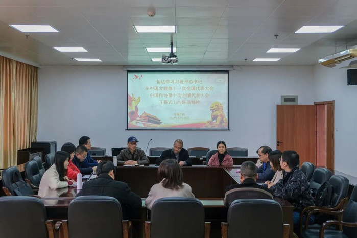 近日,传播学院召开座谈会传达学习习近平总书记在中国文联第十一次全国代表大会和中国作协第十次全国代表大会开幕式上的重要讲话精神。院领导郑文灿、谢宗贵、谢秀俤、张梅,以及影视艺术系教师参加了会议。
